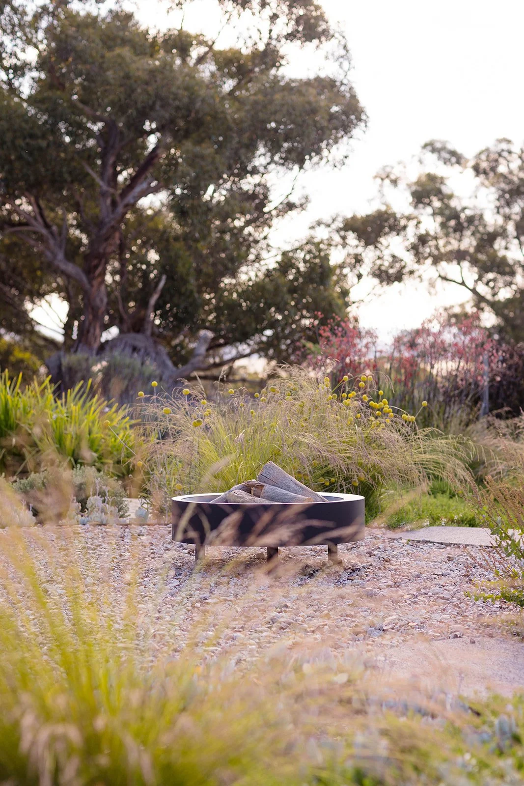 A winding path draws you through to a seating area with a fire pit at the highest point, where you can take in the sunset and sweeping views.